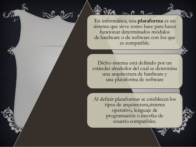 - 1. En informática, una plataforma es un sistema que sirve como base para hacer funcionar determinados módulos de hardware o de software con los que es compatible. Dicho sistema está definido por un estándar alrededor del cual se determina una arquitectura de hardware y una plataforma de software Al definir plataformas se establecen los tipos de arquitectura,sistema operativo, lenguaje de programación o interfaz de usuario compatibles.
