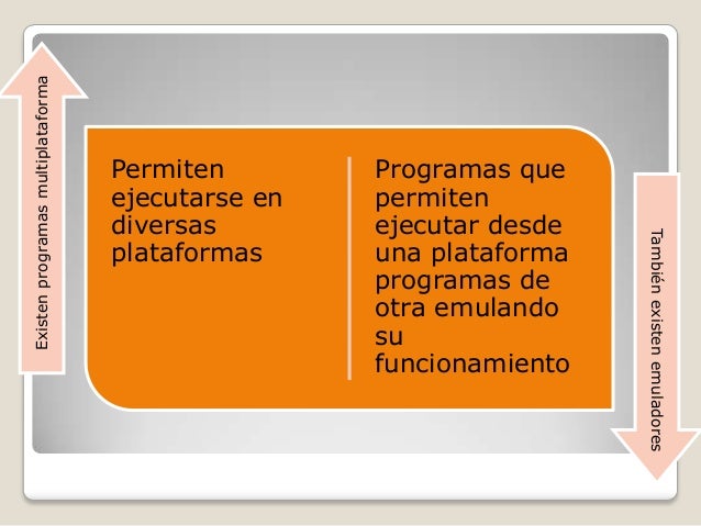 - 3. Existen programas multiplataforma Permiten Programas que ejecutarse en permiten diversas ejecutar desde También existen emuladores plataformas una plataforma programas de otra emulando su funcionamiento